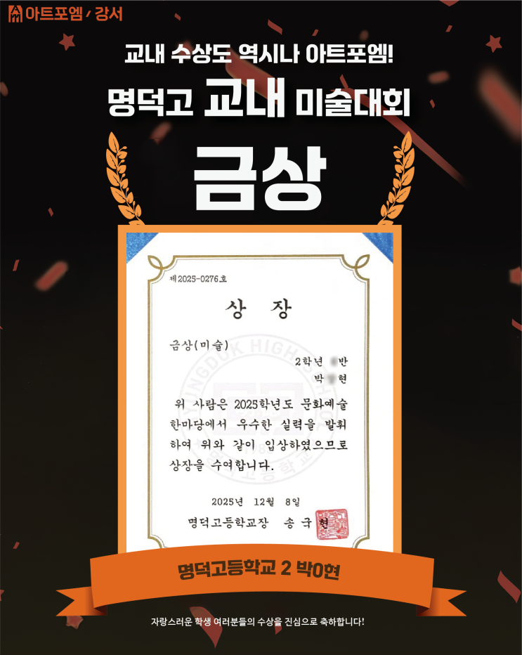 교내 미술대회 수상, 말이 아니라 ‘상장’으로 증명했습니다 강서구미술학원 아트포엠 명덕고 교내 미술대회 금상·은상 수상 소식 안녕하세요. 강서 아트포엠 미술학원입니다. 학원을 선택할 때 가장 많이 듣는 말은 “잘 가르친다”입니다. 하지만 고등부는 특히 더 현실적인 기준이 필요합니다. 학교 수업과 수행평가, 교내 활동까지 동시에 굴러가는 시기이기 때문이죠. 그래서 학부모님들이 마지막에 꼭 묻는 질문도 비슷합니다. “그래서 학교 안에서도 결과가 나오나요?” 저희는 그 질문에 말로 답하지 않겠습니다. 교내 미술대회 수상으로 증명하겠습니다. 최근 명덕고등학교 2025학년도 문화예술 한마당(교내 미술대회)에서 아트포엠 학....... <img src="https://blogthumb.pstatic.net/MjAyNTEyMTVfODkg/MDAxNzY1NzI2MTQ4Mjg2.qJNUko_YK32oDAI6hyf8mwaCRBNkLaQqipIJFPxQisEg.ejRy7Q4AXGhdMa6QgbP0S83CWXMFbyKAQTp4NcOajOog.PNG/%B8%ED%B4%F6%B0%ED_%B1%B3%B3%BB_%BC%F6%BB%F3_%C0%CC%B9%CC%C1%F6_%281%29.png?type=s3" />