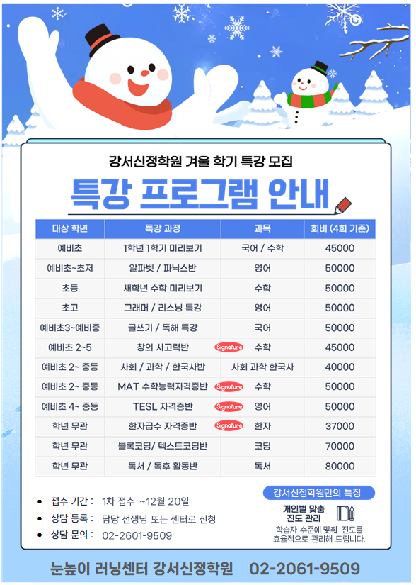 아이들의 학습 격차를 줄이고, 실력을 확 끌어 올릴 수 있는 절호의 골든 타임, 겨울방학! 신정초 눈높이 강서신정학원에서 겨울 특강을 준비했습니다 예습 / 복습 및 자격증 / 독서 /코딩 반까지 아이들의 수준에 맞춰 개인별 맞춤 진도 관리! 자격증반 : 한자 / 영어 / 수학 <img src="https://blogthumb.pstatic.net/MjAyNTEyMTlfNTYg/MDAxNzY2MTM1MzI3NjYw.A6fZLkxBzgeCdBnw6iDhuliu2eF3hZRQK7ODGgSupP4g.wZ8Ng6P-rMwBM5FdRhMQAm4GcKG9cpNuphmgoMxasJwg.PNG/image.png?type=s3" />