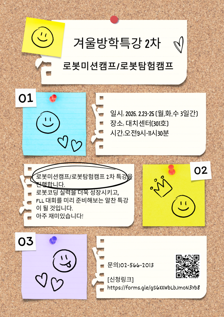 [런스팀 로봇코딩학원 겨울방학특강]로봇미션캠프 & 로봇탐험캠프 대상: 로봇미션캠프 (26년 초4~중1) 로봇탐험캠프 (26년 초2~초3) 정원: 5명 일시: 2026년 2/23, 24, 25 (월,화,수 3일간) 오전 9시~11시 40분 장소: 대치 런스팀로봇코딩학원 스케줄때문에 1월 1차 캠프에 참가하지 못한 학생들이 있어 로봇미션캠프 2차 특강을 진행합니다. 로봇코딩 실력을 더욱 성장시키고, FLL 대회를 미리 준비해보는 알찬 특강이 될 것입니다. 아주 재미있습니다! 목적: FLL 미션경기의 필수요소들을 미리 경험해 보면서 로봇제어와 문제해결을 위한 집중력을 키울 수 있습니다. 특강 경험자들은 추후 FLL 챌린지 대회에서 유감없이 실력을 발휘할 수....... <img src="https://blogthumb.pstatic.net/MjAyNjAxMjJfMTIg/MDAxNzY5MDU3Mzk4NjUz.8t90fYJ1JeI0_1Uwnx5T138Fk_C5vfbEy_EQnw7_Fzgg.Owm4wqZtxxSDE0mfjFPugdlTlslq_q86chlowbOx9wwg.PNG/%B0%DC%BF%EF%B9%E6%C7%D0%C6%AF%B0%AD_%281%29.png?type=s3" />