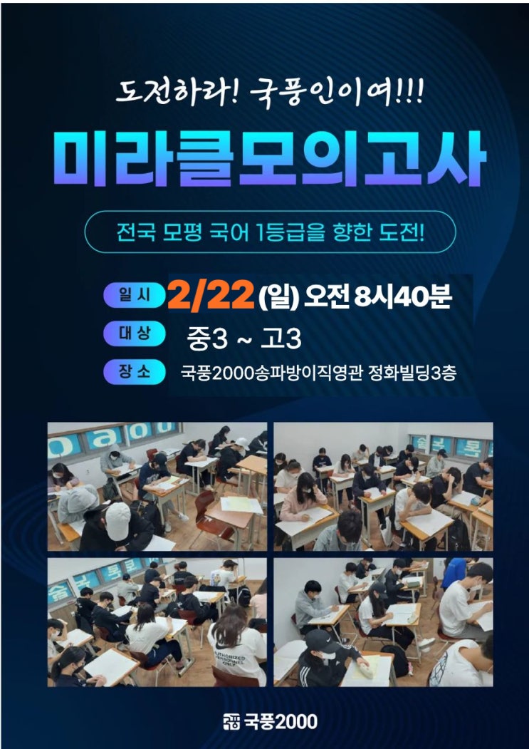 안녕하세요, 성적 향상의 바이블, 국풍2000 송파방이관입니다. 매달 마지막주 일요일에 실시하는 1등급을 향한 도전의 날!!! 매월 자신의 국어실력을 확인할 수 있는 기회 수능 첫수업 국어 !!! 같은시간에 시험현장의 긴장감까지 실감나게 연습해야합니다. *재원생은 필수 (혹시 못올경우 담당선생님께 반드시 연락하고 기한이 지나기전에응시해야함) ★외부생도 신청 가능합니다(무료응시) ◼미라클모의고사 •대상: 중3~고3 •일시: 2/22(일) AM 8:40 (10분 전 입실) 전화예약: 02) 422-3907 문자전용: 010-3323-8330 (학생명/학교학년/미라클모의고사신청) 국풍2000 송파방이관 시험을 마치고나면 SLS에 입력하고 바로 성적이 도출됩니다 정....... <img src="https://blogthumb.pstatic.net/MjAyNjAxMzFfMjcz/MDAxNzY5ODI4MjkxNzM5.FEX7ciOCHekONodA-q-u8XCg1t6L5k0zxK-_GVgDQmsg.UvMk-nVnIw0DSOZjdVbQIIX-GFgzi0--KMWjgDT1L4Eg.JPEG/%B9%CC%B6%F3%C5%AC%B8%F0%C0%C7%B0%ED%BB%E72%BF%F9.jpg?type=s3" />