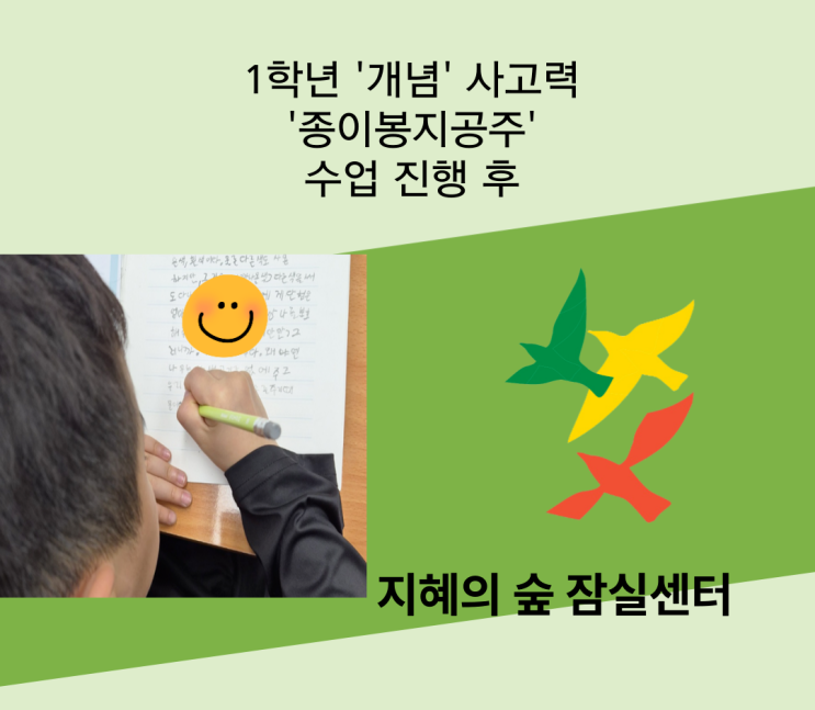 '종이봉지공주' / '개념' 사고력 수업 후 에세이 중 일부 발췌 / 지혜의 숲 잠실 글쓰기, 독서, 논술, 문해력 아름다움은 무엇일까요? 아름다움이란 무엇일까? 바로 사람답게 사는 거다. 만약 아름다움이 없다면 좀비사태처럼 세상이 뒤덮일 수 있다는 어마무시한 사실! ...... 지혜가 있으면 좀비를 어떻게든 막을 수 있지 않을까 라는 생각이 들거 같다. 종이봉지공주는 지혜가 있다. 어떻게 해서든 용을 물리치려고 애를 썼다. 겨우겨우 구했는데 왕자가 이상한 말을 해서 결국 두 사람은 결혼을 하지 않았다. 아름다움은 외모를 봐서 말하는게 아니다. (겉모습) 외모가 아닌 나 마음, 마음을 보고 말하는거다. 어떤 사람....... <img src="https://blogthumb.pstatic.net/MjAyNjAyMDRfMTEg/MDAxNzcwMTY5OTE0NDc5.kEeNOKL-DyCauC3TvXGo4udU_2754cIR3yKcN7ULaCEg.B1BTR0k5zsByIaZWjrx_Y31JFe8YN8sMJalg_c0W5kIg.PNG/20260131-%BA%ED%B7%CE%B1%D7-005.png?type=s3" />