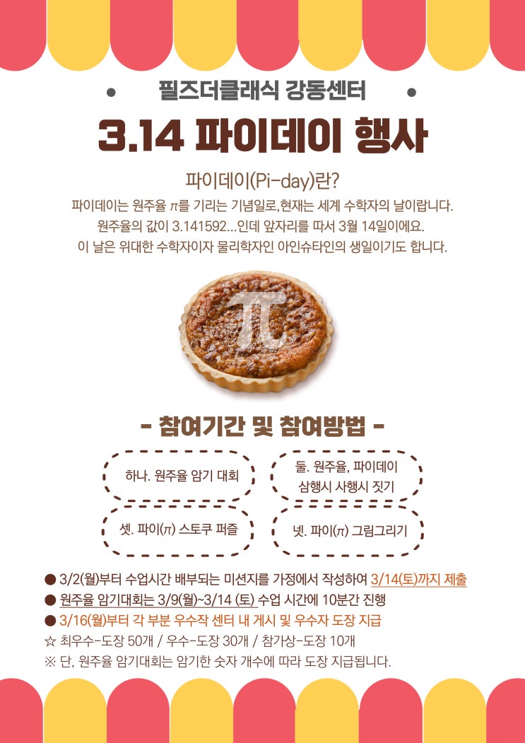 안녕하세요 :) 필즈더클래식 강동고덕센터입니다. 3월 14일 세계 수학자의 날을 맞아 필즈 고덕센터에서는 파이데이 행사를 합니다~ 원주율 암기대회 / 삼행시, 사행시 짓기 / 파이 스토쿠 퍼즐 / 파이 그림그리기 총 4개의 미션지를 3/2(월)~3/14(토)까지 가정에서 작성하여 담임교사에게 제출하면 됩니다~ 미션지는 2월 4주~3월 1주 각 반에서 배부할 예정입니다.^^ 또, 센터에는 아이들이 직접 발자국으로 원의 둘레와 지름을 재어 원주율을 계산해 볼 수 있는 작은 체험공간을 마련하려고 합니다. 각 주제별 최우수상, 우수상 선발 및 칭찬도장을 통한 시상이 있으며 수상작은 센터 내 게시 예정입니다. 우리 아이들이 파이데이 행사를 통해....... <img src="https://blogthumb.pstatic.net/MjAyNjAyMjdfMTAw/MDAxNzcyMTgyMTkwNjkz.BYevowSAAUvuKvP9v-RvDUfApiyj6jtHzCDtL60g0p4g.E1u85Ww8szi4qqpEc8C8u0NwxKkDpt7BLUinw2D9cHog.JPEG/2026%C6%C4%C0%CC%B5%A5%C0%CC_%B0%ED%B4%F6.jpg?type=s3" />