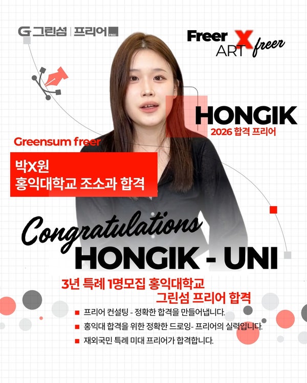 안녕하세요^^ 홍익대학교 미대 3년 전형 최종 결과로 인사드리는 프리어입니다~ 재외국민입시는 3년 결과로 실력이 검증됩니다~ 12특 학생들은 서울대 홍대 국민대에서 모두 전원 합격의 결과를 안겨주었습니다. 진짜 실력 3년특례 결과로 승부합니다. 홍익대학교 미대 합격, 우연이 아닌 설계입니다 2026 재외국민 미대 특례 합격 결과 – 그린섬 프리어 미대 입시에서 특히 재외국민 특례 전형은 단순한 실기 준비만으로 합격하기 어렵습니다. 처음 재외국민 전형으로 미대를 가고자 할 때, 재외국민전형을 모집하는 대학교, 모집 시 평가 기준, 등 모든 것이 어렵게 느껴집니다. 재외국민 특별 전형에서는 포트폴리오, 드로잉, 면접, 전략까지....... <img src="https://blogthumb.pstatic.net/MjAyNjAzMTBfMTc5/MDAxNzczMTM4ODA1NTg4.85pOvwRxedeJi5L-YvhqJlh7UgiOWtqGSdY1PIHitlog.HIuNa9cdBH30KCOogsCfb5rslt1wk7g0FrLd__UP3hkg.JPEG/1.jpg?type=s3" />