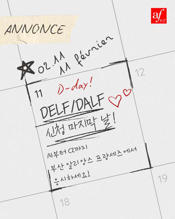 오늘이 DELF 신청 마감일입니다. 아직 신청을 완료하지 않으셨다면, 기회를 놓치지 마세요. 마감 이후에는 추가 접수가 불가하오니, 오늘 중 반드시 신청을 완료해주시기 바랍니다. Dernier jour d’inscription au DELF. Si ce n’est pas encore fait, merci de finaliser votre inscription aujourd’hui. Ne manquez pas cette occasion de certifier officiellement votre niveau de français. 신청하기 https://www.delf-dalf.co.kr/ko/ #부산알리앙스프랑세즈 #부산프랑스어 #델핀 #달프 #delf #delfdalf <img src="https://blogthumb.pstatic.net/MjAyNjAyMTFfMjk5/MDAxNzcwNzkzNDA5MzQ4.-fjCcP33pXA0xtOc8gTgvN8itdVVqWph5ier6tlgQxkg.bteO5auUV0JeOLELIWlegB4LA0guYYrJm9XTOXsXxTYg.PNG/%60_%281%29.png?type=s3" />