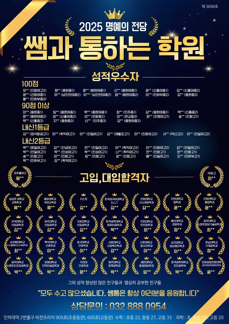 [인천 용현동 쌤통학원] 2025년 명예의 전당 - 성적우수자, 특목고 합격자, 대학 합격자