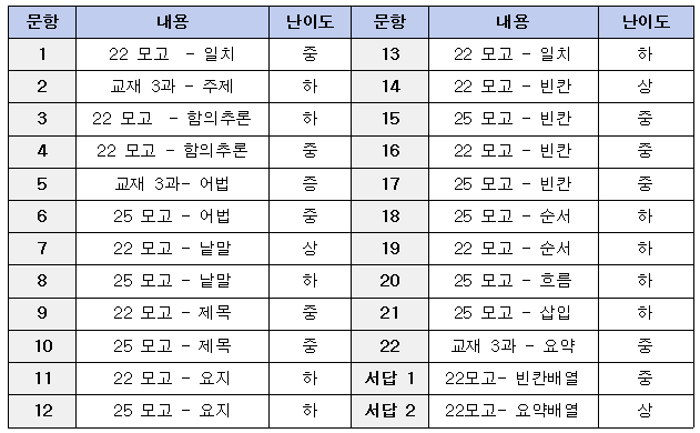 논현고 1 2025년 2학기 기말고사 문제 출제비율 2025 9모 11개 2022 9모 10개 교재 3개 주제/제목/요지 5개, 배열/흐름 4개, 빈칸 4개, 요약 1개 어휘 2개, 어법 2개, 함의추론 2개, 세부 2개, 서답 2개 “총평” 혼란을 주는 선지와 어휘 및 서술형으로 난이도 조절한 시험. 기본적인 어법과 흐름을 묻는 내용이 많았으며 송천고와 상당히 비슷한 출제 경향이 있었습니다. 특히 서술형은 주어진 단어가 많아서 위치에 맞게 쓰는 것이 상당히 오래 걸리거나 문법 실수를 범할 가능성이 많았습니다. 어법은 평소처럼 변형 없이 거의 그대로라 어렵지 않았으며 어휘는 동의어의 활용이 적절했습니다. 모의고사처럼 빈칸 문제들도 반대되는 내용으로....... <img src="https://blogthumb.pstatic.net/MjAyNTEyMThfMTAy/MDAxNzY2MDQ3MDg3MTQ1.xi2wG5dvWogQfMma0G75pnnGJPOpQf7fH5AlpmX16wcg.XktsSmksinphzm8hRepgaaCPChpvZ6uDXYvXkVXTxDwg.PNG/image.png?type=s3" />