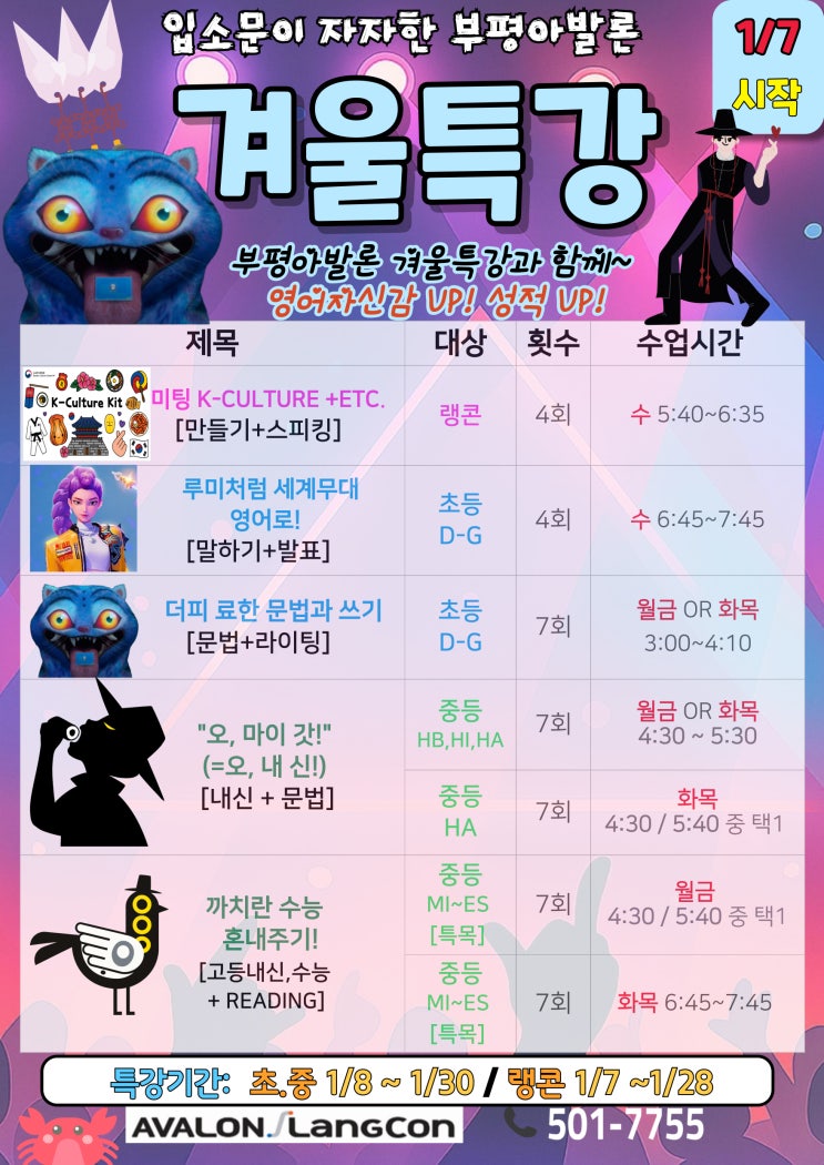 부평산곡동영어학원, 청천동영어학원 - 입소문이 자자한 부평아발론 겨울특강 1/8 개강!