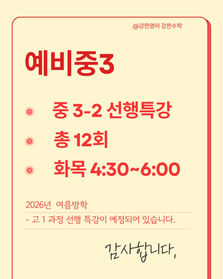 겨울방학 수학 특강을 준비하며 겨울방학이 가까워질수록 “이번 방학에는 뭘 해야 할까요?”라는 질문을 많이 받습니다. 선행을 해야 할지, 지금까지 배운 걸 다시 정리해야 할지, 아이마다 상황이 다르기 때문에 정답은 하나가 아니라고 생각합니다. 이번 겨울방학 수학 특강은 무조건 앞서 나가기 위한 수업이 아니라, 다음 학기로 넘어가기 전에 반드시 정리되어 있어야 할 부분을 중심으로 준비했습니다. 수업을 오래 하다 보니 학생들이 수학을 어려워하는 이유가 ‘노력을 안 해서’라기보다는 중간에 놓친 지점이 쌓였기 때문인 경우가 훨씬 많다는 걸 느낍니다. 삼산동 수학학원 강한수학 수업에서는 정답을 맞혔는지보다 어디까지 이해....... <img src="https://blogthumb.pstatic.net/MjAyNTEyMTZfMTQg/MDAxNzY1ODY3MzA2MTc0.qWiKqMW_8N8ItwIBAMPmLCCaQgLgfWEGWgFlwz4MnjIg.e62DpUILOfLzBM56b6Bs4rPJU05YnVL7Yf2lQIzQ-W8g.PNG/1.png?type=s3" />
