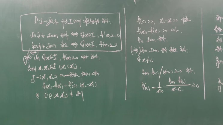 증가함수와 미분의 관계 평균값 정리로 이해하는 함숫값 변화의 원리 1기본 개념: 왜 미분을 사용할까? 수학에서 어떤 함수가 증가한다는 것을 엄밀하게 표현하려면, 구간 내 임의의 두 지점 x₁, x₂를 선택하여 x₁ < x₂일 때 f(x₁) < f(x₂)가 항상 성립함을 보여야 합니다. 그러나 이러한 정의 방식은 두 개의 변수를 동시에 다뤄야 하므로 계산 과정이 복잡해집니다. 2충분조건 증명: f'(x) ≥ 0 → 증가함수 특정 구간에서 모든 지점 x에 대해 f'(x) ≥ 0이라고 가정해봅시다. 이제 해당 구간 내에서 임의로 두 값 x₁, x₂를 선택합니다 (단, x₁ < x₂). 우리의 가정에서 f'(c) ≥ 0이고, x₁ < x₂이....... <img src="https://phinf.pstatic.net/image.nmv/blog_2025_12_15_1058/FKKt037Yw4_01.jpg?type=f480x480" />