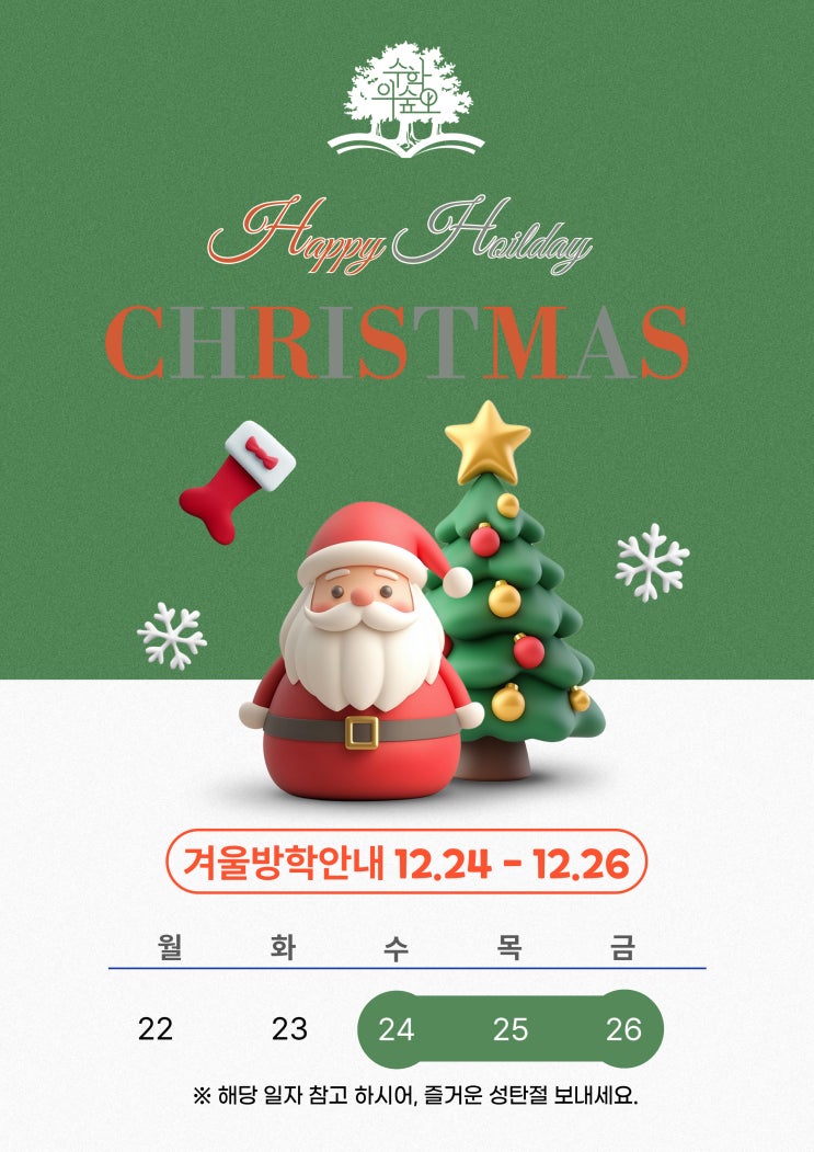 청라 수학의숲 겨울방학 기간 : 12월24일~12월26일 가족들과 즐겁고 행복한 성탄절 보내세요. 상담예약 안내 네이버 예약 또는 문자로 1. 학교와 학년 2. 현재 진도상황 3. 간단한 상담내용 기입후 요청주시면 일정확인 후 방문상담&입학테스트 가능합니다. 010.9631.1577 <img src="https://blogthumb.pstatic.net/MjAyNTEyMTZfMjg1/MDAxNzY1ODc0ODIwNTEw.OlOabYX0fnYVa3qSp3dgcf6he2HHrEGRzAvQS8k4MZcg.tS7HuldsXSgdFagQaVy0GqTP-wXZyNofNOwSmutZ_C8g.JPEG/%C1%A6%B8%F1%C0%BB-%C0%D4%B7%C2%C7%D8%C1%D6%BC%BC%BF%E4_-001_%284%29.jpg?type=s3" />