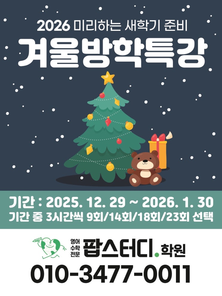 안녕하세요~ 방학특강을 10명 모집했는데 광고 게시하기 전에 마감되어 깜박하고 지금 올립니당! 방학에는 가능한 진도를 많이 나가거나, 어려운 문제 끝까지 풀어보기 연습을 해주면 새학기에 여유로운 수학점수를 받기 때문에 방학마다 특강을 이용해 보는 것도 방법입니다! 여름 방학에 많은 관심 보내 주세요! 정원 10명인데 정규반아이들은 미리 신정하기 때문에 방학 한 달전 미리 말씀해 주세요! <img src="https://blogthumb.pstatic.net/MjAyNjAxMjFfOTcg/MDAxNzY4OTUzODE2MTUx.eySR9tPGy0RqEqiH_65ea10_z2G-5Pr8b_woQ6PY6IYg.k30bbYGVtFQkpnX74OjJHFtl8DbiCYpMM5cLEuG2M3Ig.JPEG/%B0%DC%BF%EF%B9%E6%C7%D0%C6%AF%B0%AD.jpg?type=s3" />