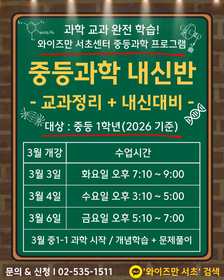 와이즈만 서초센터 3월 중등과학 내신대비반 개강 안내 안녕하세요 와이즈만 서초센터입니다^^ 중학교 1학년은 자유학기제로 운영되기 때문에 많은 학부모님께서 과학학원을 보내기에는 이른 시점이라고 생각합니다. 하지만 중학교 과학 성적이 오히려 시험이 없는 중학교 1학년에 결정되는 경향이 최근들어 많이 나타납니다. 1학년 때 배우는 주제들이 이후의 내용들에 미치는 영향이 크고, '학습 공백'으로 인해 과학 과목에서의 강점과 약점을 파악할 수 없기 때문입니다. 갑자기 어려워진 난이도와 생소한 용어들로 인해 많은 학생들이 어려움을 겪게되지만 1학년 때 개념을 탄탄히 다져놓을 수 있다면 오히려 다른 학생들과 점수....... <img src="https://blogthumb.pstatic.net/MjAyNjAxMjNfNjQg/MDAxNzY5MTU0MDg2ODM1.RCfFtMIPKvCVlWXxezlnZD2uSMzu-kPPp7Eb3iyEs9Ag.3PqcaBhFh1h6PIIPoniYwzFzc1wac7ra8JCU0ufsFZcg.JPEG/%C1%DF%B5%EE%BC%F6%BE%F7_%C6%F7%BD%BA%C5%CD-001.jpg?type=s3" />