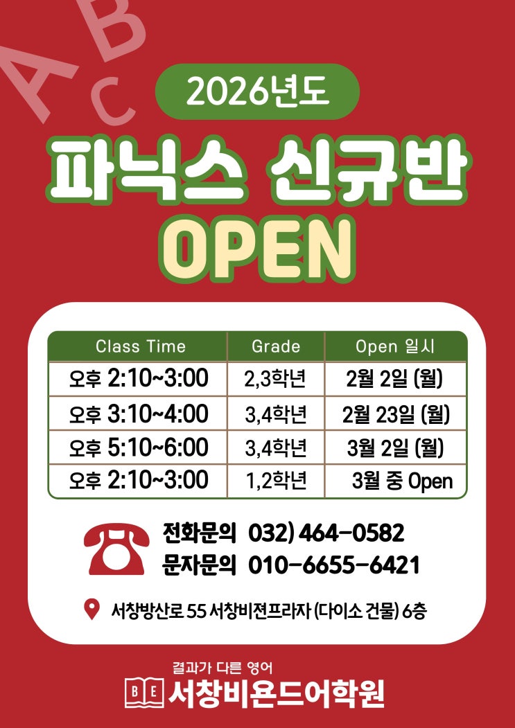 안녕하세요. 서창비욘드어학원 입니다. 새해의 설렘이 아직 남아 있는 1월, 서창 학부모님들과 아이들 모두 남은 겨울도 건강하고 따뜻하게 보내시길 바랍니다♥ 상담을 하다 보면, 유독 자주 듣게 되는 말이 있습니다. 영어를 배운 적은 있는데, 단어를 제대로 읽지는 못해요. 사실 이런 경우는 아이가 못해서가 아니라, 영어를 처음 배울 때 '외우는 영어'로 시작했는지, ‘읽는 원리’를 이해하며 시작했는지에 따라 아이의 영어는 생각보다 큰 차이를 보이게 됩니다. 많은 아이들이 단어를 열심히 외우고, 문장을 여러 번 들어봤는데도 처음 보는 단어 앞에서는 다시 멈춥니다. 그 이유는 단순합니다. 소리와 철자, 그리고 읽기가....... <img src="https://blogthumb.pstatic.net/MjAyNjAxMjJfMjY4/MDAxNzY5MDY3ODE4NDU5.mdYkYVN_ZJXMOH-4EjhiZCDDevHXecGmHGZZPJ-ytIwg.aI6ipBlM-XxLXLJL9iJqw63wlqZYc2_AYZvjG4EPJIIg.JPEG/2026_%C6%C4%B4%D0%BD%BA_%BD%C5%B1%D4%B9%DD_%BF%C0%C7%C2_%BC%F6%C1%A4%BA%BB3.jpg?type=s3" />