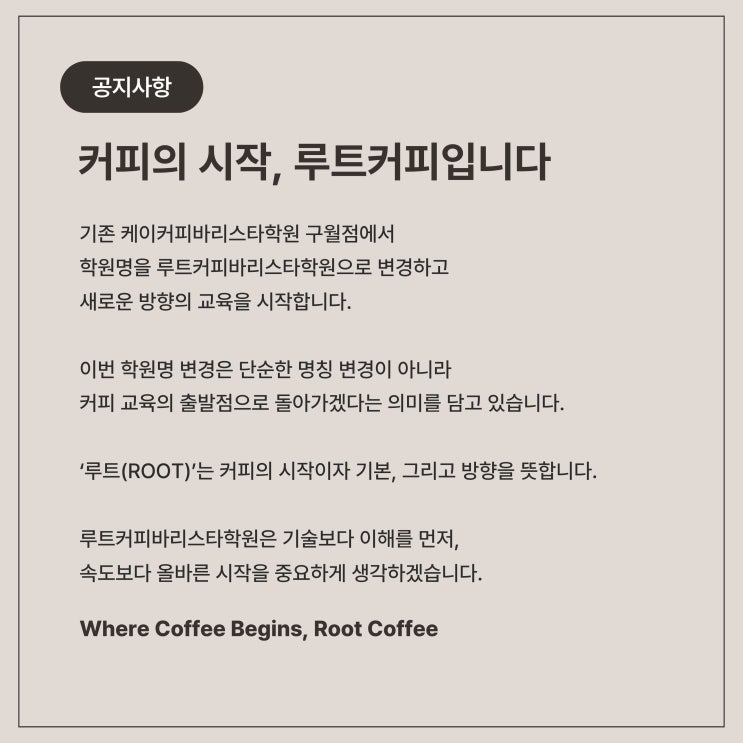안녕하세요, 루트커피바리스타학원입니다. 그동안 저희 학원을 믿고 함께해 주신 수강생 여러분께 진심으로 감사드립니다. 보다 명확한 교육 철학과 브랜드 방향성을 담기 위해 학원명을 ‘루트커피바리스타학원’으로 변경하게 되었습니다. 'ROOT(루트)'는 커피의 뿌리, 본질, 그리고 시작을 의미합니다. 기술 중심 교육을 넘어, 커피의 근본을 이해하고 직업적 전문성을 갖춘 바리스타를 양성하는 교육기관이라는 정체성을 분명히 하고자 이번 리브랜딩을 진행했습니다. 학원명만 변경되었을 뿐, 강사진, 교육 과정, 수강생 관리 시스템, 기존 수강생 혜택 및 교육 이력은 모두 동일하게 유지됩니다. 오히려 커리큘럼과 교육 환경은....... <img src="https://blogthumb.pstatic.net/MjAyNjAxMjZfMTkw/MDAxNzY5Mzk5NTI4MDQw.1VVKMPzEQ3bTLCgYszeGtBWxDSSr9FEOdYno-nrN3YIg.4qBsHgf1eDsyA3lJy0zGmqFjsHx_Yc7snf-bEP52ex8g.JPEG/%C1%A6%B8%F1%C0%BB_%C0%D4%B7%C2%C7%D8%C1%D6%BC%BC%BF%E4._%283%29.jpg?type=s3" />