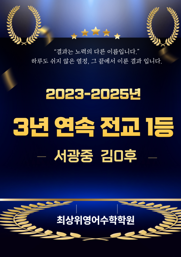 안녕하세요, 아이들의 가능성을 실력으로 증명하는 최상위학원입니다. 유난히도 뜨거웠던 학구열로 가득 찬 기말고사 기간이 지나고, 우리 학생들의 땀방울이 고스란히 담긴 값진 결과들이 도착했습니다. 오늘은 그중에서도 우리 학원의 자부심이자, 모두에게 귀감이 된 놀라운 소식을 전해드리고자 합니다. 3년의 약속, 그리고 ‘평균 99.9’라는 압도적 증명 단 한 번의 1등도 쉽지 않지만, 3년 내내 그 정점의 자리를 지켜낸다는 것은 단순히 성적을 넘어 학생의 성실함과 흔들리지 않는 평정심을 보여주는 지표입니다. 우리 김00이 이번 중학교 마지막 기말고사에서도 평균 99점이라는 경이로운 성적을 거두며, 3년 연속 전교 1등이라는....... <img src="https://blogthumb.pstatic.net/MjAyNTEyMzBfOTkg/MDAxNzY3MDkzNTc3NTU4.0quchGnvIxzbNZoud3xsjes0IfyRrRAnCE8aZuOBAIUg.P7LeE1R39fvlnQrhr6GI_9FfJIZJMkg4RNU_upW9Y-cg.PNG/002.png?type=s3" />