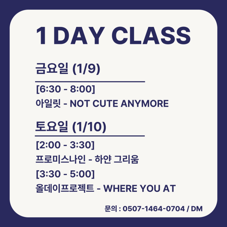 ️ 1월 둘째 주 원데이 수업 안내 안녕하세요, 아지트 뮤직댄스 학원 봉선점입니다 :) 새해를 맞이하여 학원 수업 일정 안내드립니다. 1월 둘째 주에는 특별 원데이 수업이 진행됩니다! 하루 동안 부담 없이 참여하실 수 있는 원데이 클래스로, 새해를 활기차게 시작하고 싶은 분들께 추천드려요 ✨ 또한, 1월 둘째 주 정규 수업은 모두 정상적으로 진행되오니 기존 수강생분들께서는 평소와 동일하게 수업 참여해 주시면 됩니다. 바쁜 일상 속에서도 항상 저희 학원에 관심 가져주시고 찾아주셔서 진심으로 감사드립니다. 원데이 수업을 통해 새로운 에너지를 채우고, 정규 수업에서는 더욱 즐겁고 집중도 높은 시간으로 함께해요 ....... <img src="https://blogthumb.pstatic.net/MjAyNjAxMDVfMTMz/MDAxNzY3NjEwMDAyOTg1.G7iYr9AxgN54lrhH9DFaMQdUacHdvRF_1vv9FgbSfiAg.QFPmkG95i2DsFoYWqaexrd-RSRPGOtyhoc3g_u03-u0g.PNG/001.png?type=s3" />