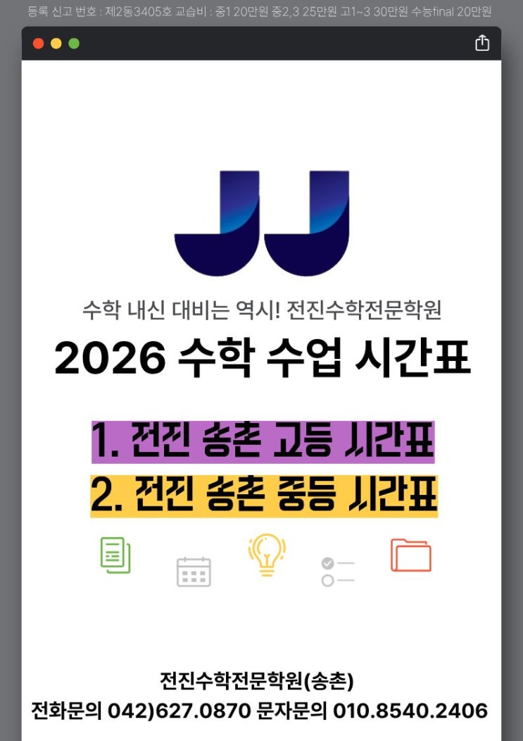 안녕하세요! 전진수학입니다. 2026년도 수학 수업 시간표를 안내드립니다! 전진수학의 모든 수업은 수준별 반편성으로 이루어집니다. 각 학생의 이해도와 문제풀이 능력 수업태도와 숙제 성취도를 고려하여 편성되었습니다~^^ 수업 시간 문의 및 TEST 신청 송촌원 원장 010-8540-2406 (문자) '학교/학년/이름'을 문자로 남겨주시면 순차적으로 무료 시범강의와 입학테스트 일정을 안내드리고 있습니다. 2026 고등 내신대비 수업 시간표 전진수학 고등 수업 정규 시간을 통해, 2026 1학기 내신을 준비하고 겨울 방학 특강으로 2026 2학기를 한걸음 더 먼저 준비할 수 있습니다! 아래 링크를 통해 확인할 수 있습니다. 전진수학 고등 시....... <img src="https://blogthumb.pstatic.net/MjAyNjAxMDdfMzEg/MDAxNzY3Nzc5MzQ5MDU1.YjG4CzV0GaHY2ZpokB5zO96HAwrCS0MeOVP3vZlmi00g.9yMVvo2liRHTHARNWGG9TKQ_MYu4E36Jte7EnqfGpQ0g.JPEG/2026_1%C7%D0%B1%E2_%BD%C3%B0%A3%C7%A5_%282%29.jpg?type=s3" />
