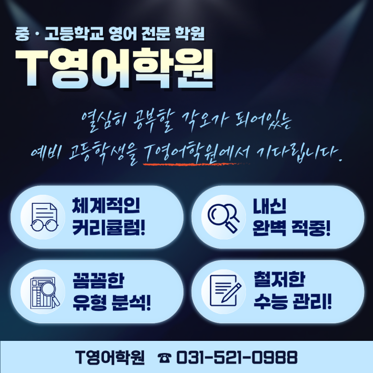 안녕하세요 T영어학원입니다 예비 고1, 지금 준비 방향이 맞는지부터 점검하셔야 합니다 중등 내신 성적이 좋다고 고등 영어까지 그대로 이어지지는 않습니다. 고등 영어는 ✔ 지문 길이 증가 ✔ 어휘·구문 난이도 급상승 ✔ 내신은 서술·변형 중심 ✔ 수능까지 동시에 고려해야 하는 구조 중등부 때와는 모두가 완전히 달라집니다 그래서 예비 고1 시기에 가장 중요한 체크포인트는 중등 내신 점수가 아닙니다. 반드시 확인해야 할 두 가지 ✔ 고등부 모의고사 방식으로 연습이 되어 있는가 지문 길이, 문제 유형, 시간 압박까지 고등 시험 구조에 맞게 훈련되고 있는지가 핵심입니다. ✔ 실제 모의고사 기준에서 등급이 나오는가 ‘잘한다’는....... <img src="https://blogthumb.pstatic.net/MjAyNTEyMjFfMTc2/MDAxNzY2MzA4NjA3MjIx.LQw5xdlbQYPTv8AsInkQCr_IX4LJo5-csawe4SmGG3Ug.-VcjXhXEOTd3dEXXRxsfHJH6Vc33R2xtMl385mqaWqMg.PNG/image.png?type=s3" />