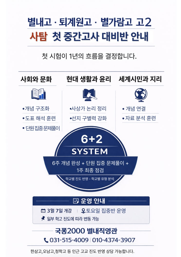 안녕하세요. 성적향상의 바이블! 수능·내신·학종의 삼위일체 학습법 국풍2000 별내직영관입니다. 고2 사탐 첫 중간고사 대비반을 안내드립니다. 신학기가 시작되었습니다. 신학기 초반은 아직 시험이 멀게 느껴질 수 있지만, 바로 이 시기에 준비 방향이 결정됩니다. 특히 사탐 과목은 처음 단원을 어떻게 정리하느냐에 따라 첫 중간고사의 결과가 달라집니다. 학교마다 진도 속도와 범위, 출제 방식은 조금씩 다릅니다. 그래서 단순한 문제풀이가 아니라 학교별 진도를 반영한 준비가 필요합니다. 국풍2000 별내직영관은 고2 사탐 과목을 6+2 구조로 설계하여 6주는 개념과 단원을 완성하고, 2주는 약점 보완과 최종 점검으로 첫 시험까지 안정....... <img src="https://blogthumb.pstatic.net/MjAyNjAzMDNfMTk1/MDAxNzcyNTI2NTI1NjY0.2wLPHOqrGwjHGQlKoS-SM97gwtCkkzfFgAWoYZtXvMYg.aQIrNidYszznEFF21iZOqBnMq8Vt9Gv0aGSbI2OhzoMg.JPEG/%C1%A6%B8%F1%C0%BB-%C0%D4%B7%C2%C7%D8%C1%D6%BC%BC%BF%E4_-001.jpg?type=s3" />