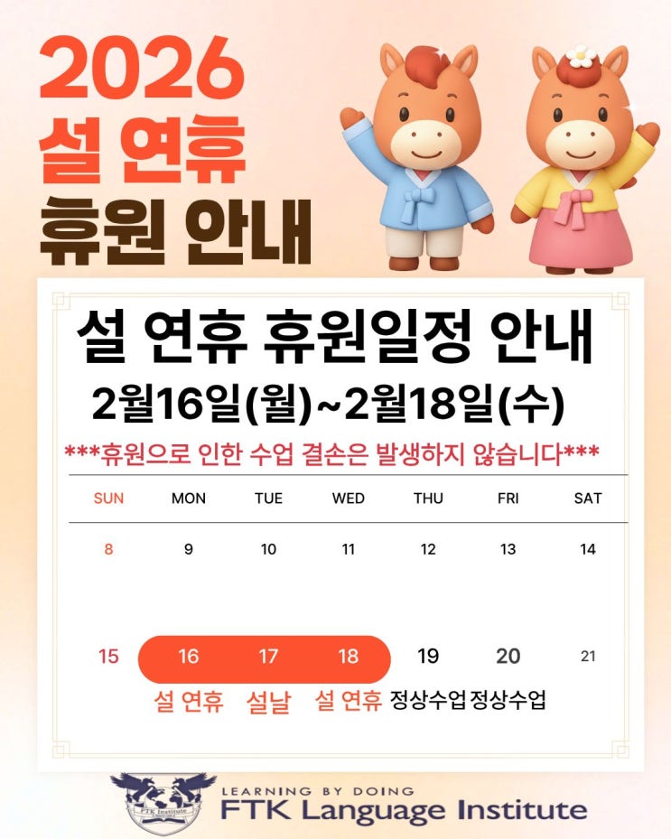 안녕하세요. FTK Language Institute 입니다. 2026년 설날을 맞아 학원 설 연휴 휴원 일정을 아래와 같이 안내드립니다. 설 연휴 휴원 일정 2026년 2월 16일(월) ~ 2월 18일(수) 해당 기간 동안 학원은 전체 휴원이며, 모든 정규 수업은 진행되지 않습니다. 설 연휴 휴원으로 인한 수업 결손은 발생하지 않습니다. 정상 수업 안내 2026년 2월 19일(목)부터 기존 시간표대로 정상 수업이 재개됩니다. FTK는 연휴 이후에도 학습 흐름이 끊기지 않도록 수업과 관리 모두 안정적으로 이어가겠습니다. 가족과 함께 따뜻하고 편안한 설 연휴 보내시길 바랍니다. 새해 복 많이 받으세요. FTK Language Institute 드림 #향남영어학원 #향남어학원 #FTK향....... <img src="https://blogthumb.pstatic.net/MjAyNjAyMTBfMjQy/MDAxNzcwNzA2MzQ1NDAx.sbi44IJWGcYOF-5QSkOVh5_9v9PuthA2A9_sPcX3eaMg.W7QKbrYIfrmF1Wh-06L9o0kAahiOV7-9VSfFUkXL77Ug.JPEG/KakaoTalk_20260210_154429935.jpg?type=s3" />