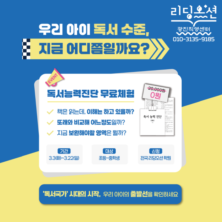 안녕하세요^^ 광장동 독서논술교육의 중심 리딩오션입니다. 신학기를 맞아 2026.03.03(화) ~ 2026.03.22(일) 동안 진행되는 독서능력진단 무료체험 이벤트를 소개드립니다! 리딩오션의 독서능력진단평가를 통해 우리 학생의 문해력을 정밀하게 알아볼 수 있습니다. 독서능력진단검사는 리딩오션 광진직영점 본원에서 자필로 실시하며, 30~40분 정도 소요됩니다. 이후 독서능력진단결과 리포트 결과를 바탕으로 상담을 받고, 도서 큐레이팅을 진행합니다. 이벤트 신청은 리딩오션 광진직영점 전화번호 카카오톡: 010-3135-9185 로, 아래 내용을 복사하여 보내주시면 신청이 완료됩니다. [독서능력진단검사 무료이벤트 신청] 이름: 학교: 학년:(26년....... <img src="https://blogthumb.pstatic.net/MjAyNjAyMTlfMTI0/MDAxNzcxNDY4OTE4OTYz.3l0smiOlWhAVb6wTPx8oi4FmKCICBgYQbqxZIN4ZFMwg.Ul2fgMRjV4C0FNTuiMMtZJozgmtS0R4TuOZDdKVPla0g.PNG/2026%BA%ED%B7%CE%B1%D7-%BD%E6%B3%D7%C0%CF-%C1%A6%C0%DB-001.png?type=s3" />