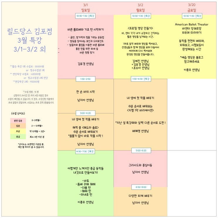 안녕하세요, 오늘은 릴드당스 김포점 3월 시간표 안내드립니다. 2026년의 봄에도 여러분들이 릴드당스에서 발레를 만나며 "내 인생은 발레를 만나기 전과 후로 바뀌었어" 라는 생각이 들 수 있기를 바랍니다. 발레를 통해 나의 몸과 움직임을 바라보는 생각이 바뀌고, 움직임을 경험하는 폭이 더 커지고, 음악을 몸으로 만나는 경험으로 기쁨을 얻으실 수 있기를 바랍니다. 릴드당스 김포점 3월 신규/추천 수업 안내 [초록] 센터 집중반(바 30분) 금요일 낮 12:00 황민혜T 기본을 다지는 바 30분 수업 후, 센터에서 테크닉과 표현력을 집중 훈련하는 중급 레벨 클래스입니다. 바는 자신 있는데, 센터만....... <img src="https://blogthumb.pstatic.net/MjAyNjAyMjBfMjUx/MDAxNzcxNTg3ODY3Mjc2.NMEnzIEyuJ_T2UAaAklcOuCMkLRuw9gny8Hdxa6PNw0g.ac9S2FE955cO0MJTXZ1QhZoo4mZ_yusWHZdtz7KxR6Qg.JPEG/%B8%B1%B4%E7_%B1%E8%C6%F7_3%BF%F9_%C6%AF%B0%AD.jpg?type=s3" />