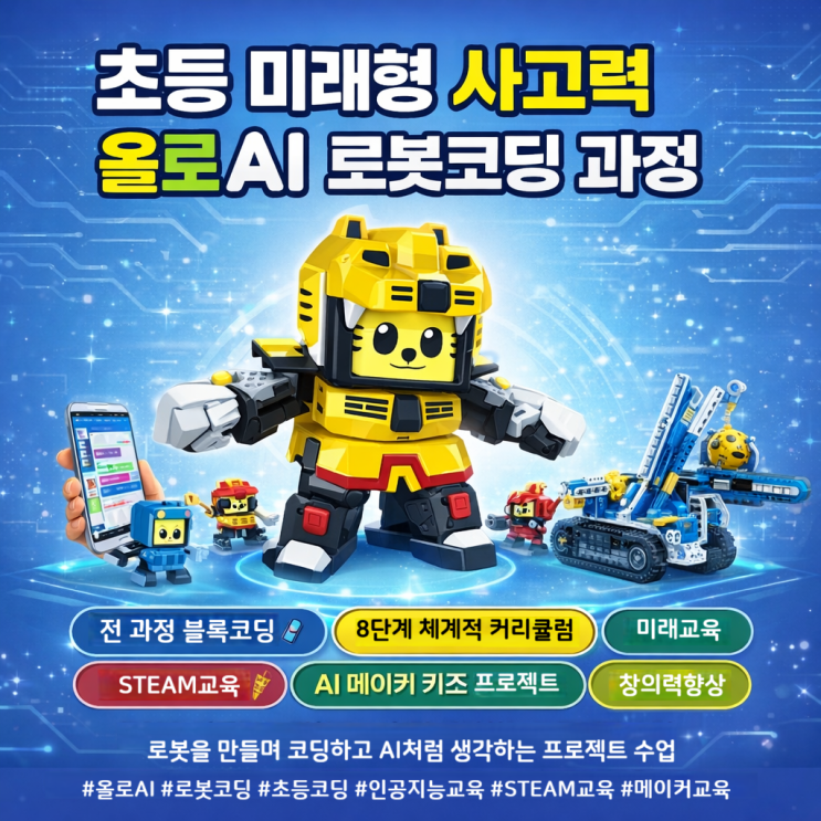 초등 미래형 사고력 올로AI 로봇코딩 과정 과정명 : 초등 미래형 사고력 올로AI 로봇코딩 과정 교육교구 : 로보티즈 올로AI 추천연령 : 유아7세/초등 1~6학년 입문가능연령 : 유아7세~초등저학년(코딩 경험 없이도 가능) 심화 추천 : 초등 고학년 (사고력,AI,텍스트 코딩 확장) 수업시간 : 주1회 90분 수업형태 : 소수 정원 / 개별 맞춤 지도 진행방식 : 조립 → 코딩 → 조작 → 미션수행 AI시대를 살아갈 우리 아이에게 필요한 것은 단순한 코딩 기술이 아닙니다. 문제를 이해하고, 스스로 해결 방법을 설계하며, 실패를 반복하면서도 다시 도전하는 사고력과 문제해결력 입니다. 초등 미래형 사고력 올로AI 로봇코딩 과정은 아이들이 로봇을 직....... <img src="https://blogthumb.pstatic.net/MjAyNjAyMTFfMjU4/MDAxNzcwNzU3NDA3NjI1._69oynN0thQURB7DiRfdVvAS96DW_cx0fpJmq2KqUkwg.LTWdA1YStAVrBp34GgB1fhEj7cv7EK9nDLRo-N-RgXwg.PNG/ChatGPT_Image_2026%B3%E2_2%BF%F9_11%C0%CF_%BF%C0%C0%FC_05_57_40.png?type=s3" />