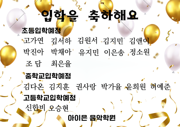 새로운 시작을 응원합니다 아이은 친구들의 초등학교 · 중학교 · 고등학교 입학 소식이 하나둘 전해지고 있습니다. 처음 만났던 작은 손으로 건반을 두드리던 모습이 엊그제 같은데, 이제는 새로운 교문 앞에 서게 될 만큼 훌쩍 성장했네요. 입학은 단순히 학교가 바뀌는 것이 아니라 더 넓은 세상으로 나아가는 소중한 첫걸음이라 생각합니다. 아이은에서 함께했던 시간들이 새로운 환경에서도 자신감과 용기가 되어주길 바랍니다 작은 축하 선물도 준비했어요 새 출발을 응원하는 마음을 담아 아이은 친구들에게 입학 축하 선물을 전합니다. 새 학기에도 음악처럼 즐겁고 자신만의 아름다운 리듬을 만들어가길 바랍니다. * 초등....... <img src="https://blogthumb.pstatic.net/MjAyNjAyMTRfOSAg/MDAxNzcxMDcwODkxODU1.CL1VeKSE91vNAiMqTZ0KQQhKKxVD_X5vCtEhScwb7KMg.xNJ06wxrm53XmGf4S_3Pi8Rsz-jLpYTrvVAbZaPrXbgg.PNG/900%A3%DF%B3%EB%B6%F5%BB%F6%B0%FA_%B0%CB%C1%A4%BB%F6_%BD%C9%C7%C3%C7%D1_%C0%CF%B7%AF%BD%BA%C6%AE_%C0%D4%C7%D0_%C3%E0%C7%CF_%C0%D4%C7%D0%BD%C4_%C7%D0%BB%FD_%C4%AB%B5%E5%A3%DF20260214%A3%DF064606%A3%DF0000.png?type=s3" />