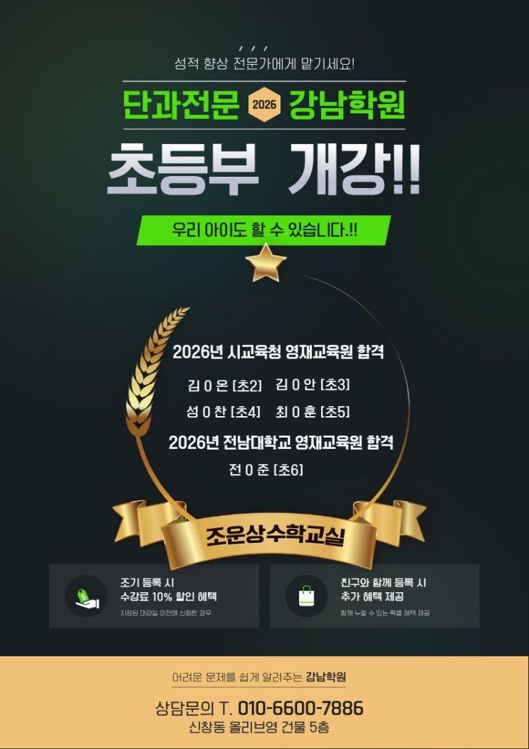 안녕하세요. 우리 아이의 성적 향상을 위해 늘 고민하고 연구하는 신창동강남학원 입니다. 2026년 새 학기, 3월을 맞아 강남학원이 한 단계 더 강력해진 모습으로 찾아옵니다. 많은 학부모님께서 기다리셨던 초등부 대개강 소식과 함께, 특별한 소식을 전해드립니다. 초등수학의 베테랑 선생님 전격 합류!! 시매쓰 등에서 풍부한 경험을 쌓으며, 아이들의 사고력과 기초를 탄탄히 잡아주셨던 베테랑 선생님께서 이제 강남학원에서 우리 아이들을 직접 지도합니다. 단순히 문제만 푸는 수학이 아닙니다. 선생님들의 노하우로 초등 시기 꼭 잡아야 할 개념의 뿌리를 확실히 심어주겠습니다. 신창동강남학원만의 '압도적 차별점' 3가지 대....... <img src="https://blogthumb.pstatic.net/MjAyNjAyMjBfNTgg/MDAxNzcxNTk4ODg3OTc2.DttwYdt3cv4UzkUgeC8u90oeMjFkZ8VcI_zVzo94lRkg.a_Bc7VhkMDYy48w5YPVkV3IerapVU2F9Tj0XvFZf1Ggg.JPEG/3%BF%F9%C0%FC%B4%DC%BE%D5%B8%E9.jpg?type=s3" />