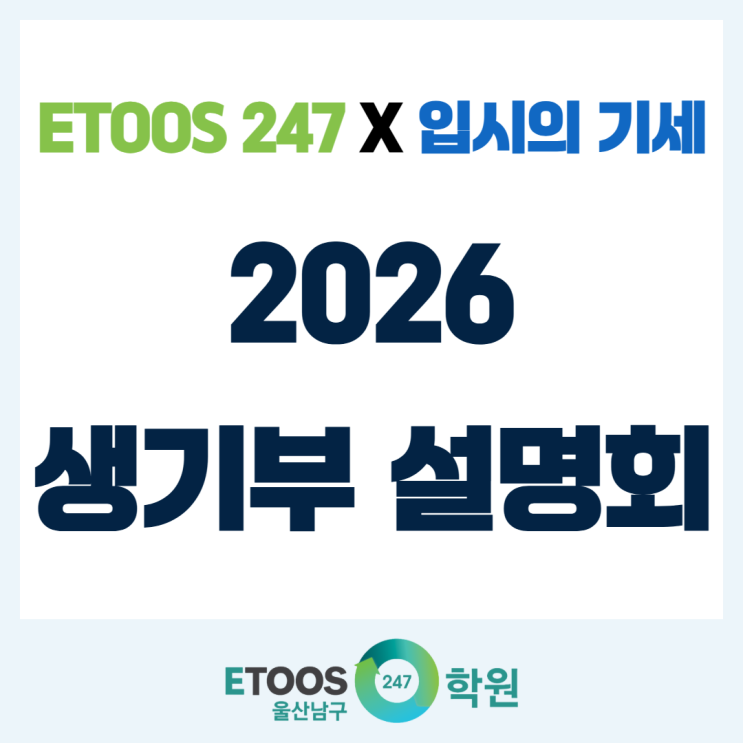 안녕하세요, 이투스247 울산남구점입니다. 시간은 모두에게 공평하지만, 결과는 전략 있는 사람의 것이 됩니다. 지금 수능을 준비하는 수험생에게는 이번이 사실상 마지막 전환점이 될 텐데요. 변화하는 입시 제도 속에서 학년별 실전 전략과 선택 기준을 정리해드릴 <2026 생기부 설명회> 대해 안내도와드리겠습니다. 이투스247 X 입시의 기세 2026 생기부 설명회 이투스247 울산남구점에서 이번에 진행하는 이번 생기부 설명회는 대치동 <입시의 기세>와 함께 합니다! <이투스247울산남구점X입시의 기세> 이번 생기부 설명회에서 다룰 주제는 생기부를 효과적으로 작성하는 법, 다가올 입시에 대비하는 법 등 고1, 고2 학생....... <img src="https://blogthumb.pstatic.net/MjAyNjAyMTNfNTQg/MDAxNzcwOTc2NzkyMTA1.obMrnieV8ECLa4-Jov5lnKsIZCSbDow4rj6ArB9jJ7cg.hE8cXjxy_b2EjRQWoGGnmFRG5pKcQWPm-nbbs4zmF_Ug.PNG/2026_%C0%D4%BD%C3%BC%B3%B8%ED%C8%B8_%BA%ED%B7%CE%B1%D7_%BD%E6%B3%D7%C0%CF%28%BB%FD%B1%E2%BA%CE%29.png?type=s3" />