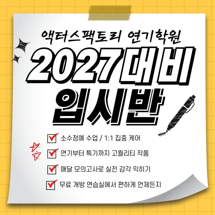 안녕하세요 액터스팩토리 수원 평택 연기학원입니다. 오늘은 저희 수원연기학원 평택연기학원 액터스팩토리 대학 입시반을 소개해 드리겠습니다. 소수 정예로 운영되는 대학 입시반은 담임제로 6명 제한을 두고 있어 한 명 한 명 소홀하지 않게 집중적인 수업이 진행됩니다. 연기, 특기, 인터뷰부터 캐릭터를 살리고 특기를 돋보기 할 수 있게 분석하고 준비하고 각 지망 대학별 특성에 맞게 입시를 철저히 대비합니다. 연기!!!! 개인 작품 3개 이상!!! 성격과 스타일이 다른 희곡, 매체 대사 등을 조화롭게 섞어 1인당 최소 3개 ~ 5개의 작품을 완성도 있게 만들어 입시에 빈틈없는 실기를 선보일 수 만듭니다. 이것은 학교별, 전공별로 다른 대....... <img src="https://blogthumb.pstatic.net/MjAyNjAxMzBfMzUg/MDAxNzY5NzY2NjIzMjk0.b5_ktPaXzSARHRhpNnhP50p-vef6-rwInZh4FZuvpJEg.yowwNi41mWvGKqde2zCA3a4a5op5zDp_T8cipnvPuiwg.JPEG/%C1%A6%B8%F1%C0%BB-%C0%D4%B7%C2%C7%D8%C1%D6%BC%BC%BF%E4_-001_%281%29.jpg?type=s3" />