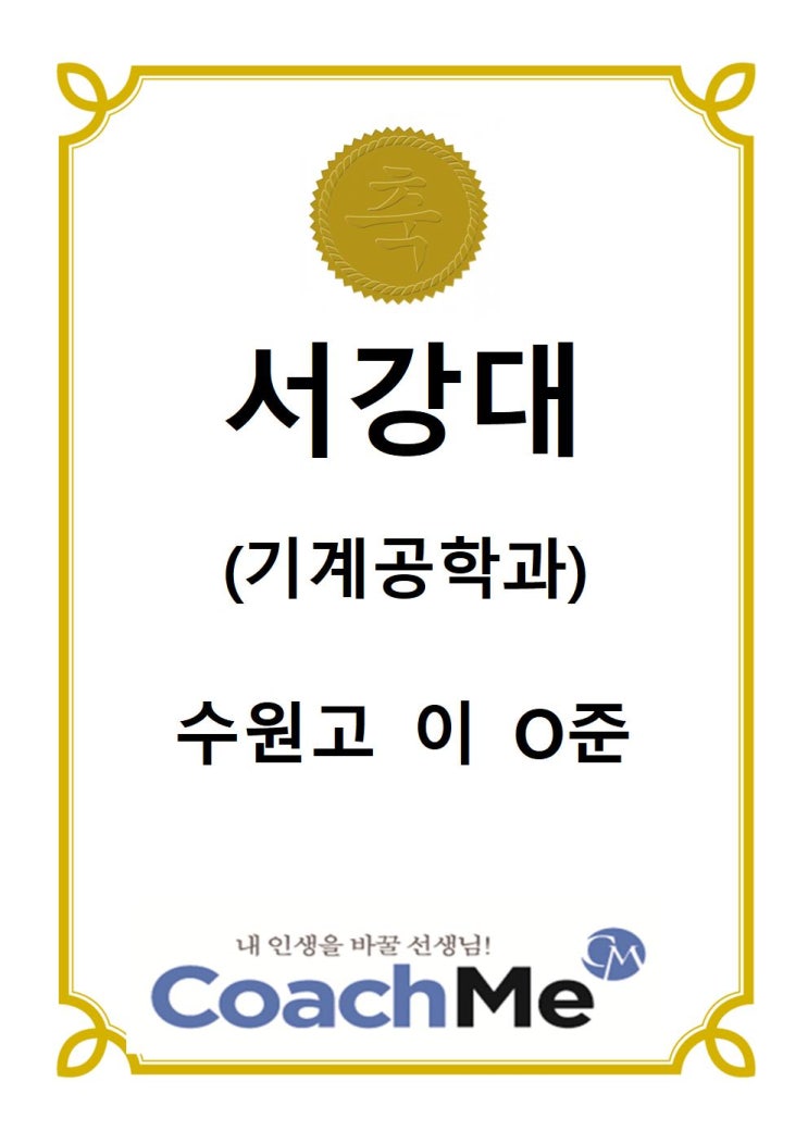 서강대학교 기계공학과에 합격한 수원고등학교 이 O준 학생에게 진심어린 축하와 격려의 박수를 보냅니다. - 코치미학원 강사진 일동 <img src="https://blogthumb.pstatic.net/MjAyNjAyMTFfMTE2/MDAxNzcwNzk5NTEwNTMy.nd_DXl-S3wCw4OB4vT_45sU0r6_IL5E_Gr--VFTuqwQg.oZ91wBULT987JBOq1yzPp8Emh_OeNnFGW5Ux1c4rchAg.JPEG/%BC%AD%B0%AD%B4%EB_%C7%D5%B0%DD_-_%C0%CC%BC%AD%C1%D8_-_%BA%ED%B7%CE%B1%D7001.jpg?type=s3" />