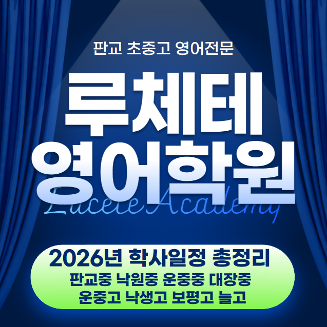 안녕하세요! 루체테영어학원 입니다^^ 2026년 새학기가 시작되면서 학생들과 학부모님들의 가장 큰 관심사는 바로 '올해 학사일정과 학습계획' 입니다. 특히 중고등학교는 시험일정과 방학기간에 따라 학습흐름이 크게 달라지기 때문에, 연간 학사일정을 미리 파악하고 준비하는 것이 매우 중요합니다. 특히 영어 과목은 단기간에 실력이 오르기보다는 꾸준한 문법 개념 학습과 서술형 대비, 독해 훈련이 함께 이루어져야 성적 향상이 가능합니다. 따라서 우리 루체테영어학원에서는 학교 일정에 맞추어 내신대비와 정규수업을 체계적으로 운영하고 있습니다. 이번 포스팅에서는 '2026년 학교별 학사일정'을 정리해보겠습니....... <img src="https://blogthumb.pstatic.net/MjAyNjAzMTJfMTc2/MDAxNzczMjkzODc2Mzc2.8LLjjBoelPDCE4IofilRvuwaHY2hNE0vPN9oQUxUKUwg.AjiooALBVALJlMv3YkD0XKyDhATQehWbvOyUgQnLud4g.PNG/image.png?type=s3" />