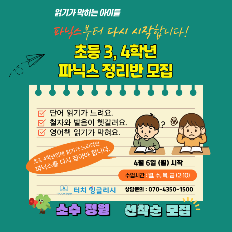 안녕하세요, 터치잉글리시 영어학원입니다. 4월부터 시작하는 초등 파닉스 4:10 반은 정원 마감되었습니다. 많은 관심 보내주셔서 감사합니다. 문의가 계속 이어져 3~4학년 대상 파닉스 정리반을 새로 모집합니다. 초등 고학년이 되면서 ✔ 단어 읽기가 불안하거나 ✔ 철자와 발음 연결이 약하거나 ✔ 영어책 읽기가 막히는 학생들이 생각보다 많습니다. 이 수업은 읽기의 기초가 되는 파닉스를 다시 정리하는 클래스입니다. 3~4학년 파닉스 클래스 4월 6일 월요일 시작 수업 : 월 · 수 · 목 · 금 2:10 정원은 많지 않아 소수 인원으로 마감됩니다. 관심 있으신 학부모님께서는 네이버 상담예약 신청해주시면 안내드리겠습니다. 감사합니다....... <img src="https://blogthumb.pstatic.net/MjAyNjAzMDhfNzgg/MDAxNzcyOTY4MTM0Mjc5.D7hUOFTUeufFMcftuVpeyUFoWHei9Zoa4ZxzK15h-4Eg.mxkl8WSVVx2JOVW_cfxIXJnnTUu-IrSSsaN-ChBwiEQg.PNG/%C1%A6%B8%F1%C0%BB-%C0%D4%B7%C2%C7%D8%C1%D6%BC%BC%BF%E4_-001_%2813%29.png?type=s3" />