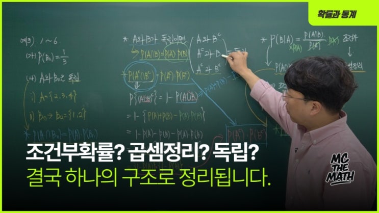 고2 확률 단원을 공부하다 보면 많은 학생들이 같은 지점에서 막힙니다. 조건부확률은 알겠는데 문제에 적용이 안 되고 독립 사건인지 아닌지 헷갈리고 곱셈정리는 외웠는데 왜 쓰는지 모르겠다는 반응. 이유는 하나입니다. 개념을 각각 ‘공식’으로만 배웠기 때문입니다. ✔ 더매쓰에서는 이렇게 설명합니다. 이번에 업로드한 영상은 조건부확률 · 곱셈정리 · 독립 사건을 서로 다른 공식이 아니라 하나의 구조로 연결된 개념으로 정리한 수업입니다. 왜 이런 식이 나오는지, 어떤 상황에서 같은 구조가 반복되는지, 문제에서 무엇을 먼저 판단해야 하는지를 칠판 설명 중심으로 차분하게 풀어갑니다. ✔ 이런 학생에게 특히 필요합....... <img src="https://blogthumb.pstatic.net/MjAyNTEyMTJfMTEz/MDAxNzY1NTE0MTYyMTc4.ZPn5XNYbKlb5lzCy4Vo7a6HMrlDcX5hUit5mPMVOCYog.jZQDprYWVRI6pjWqOayVIpYCE8mZCnMzVf-0Dmp4STQg.JPEG/900%A3%DF1765102083028.jpg?type=s3" />