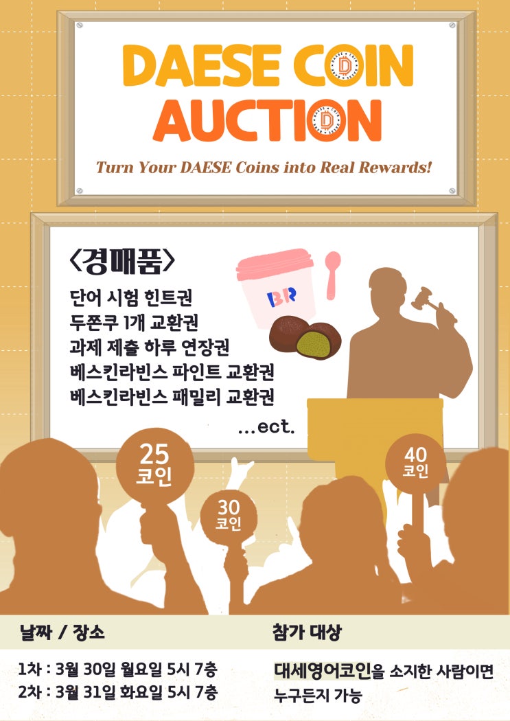 학생들이 수업과 과제를 통해 모은 대세코인으로 상품을 낙찰받는 코인 경매 이벤트를 진행합니다! 그동안 열심히 모은 코인으로 경매하는 ★대세코인경매 이벤트★를 진행합니다!! 단어 힌트권, 과제 하루 연장권, 두쫀쿠 교환권, 베스킨라빈스 교환권 등 다양한 상품이 준비되어 있으니 코인을 많이 모아둔 친구들은 꼭 참여하세요!! 1차 : 3월 30일 월요일 5시 7층 2차 : 3월 31일 화요일 5시 7층 ※5시가 수업 중 클리닉인 학생들은 반드시 담임 선생님의 허락을 받고 7층 경매장으로 오시기 바랍니다! <img src="https://blogthumb.pstatic.net/MjAyNjAzMTJfMTYx/MDAxNzczMzE2MDEyOTk1.I6iNQ7Q0j52eZsEfWKwUGV99eiEfWUzhV3dxEQD3VgQg.995KpMpW8_YVFeZadxoWZFF9PZBoAWXRn1ng8lrtbJYg.JPEG/%B4%EB%BC%BC%C4%DA%C0%CE%BF%C1%BC%C7--DAESE-COIN-AUCTION-_-%B4%EB%BC%BC%BF%B5%BE%EE%C7%D0%BF%F8-001.jpg?type=s3" />