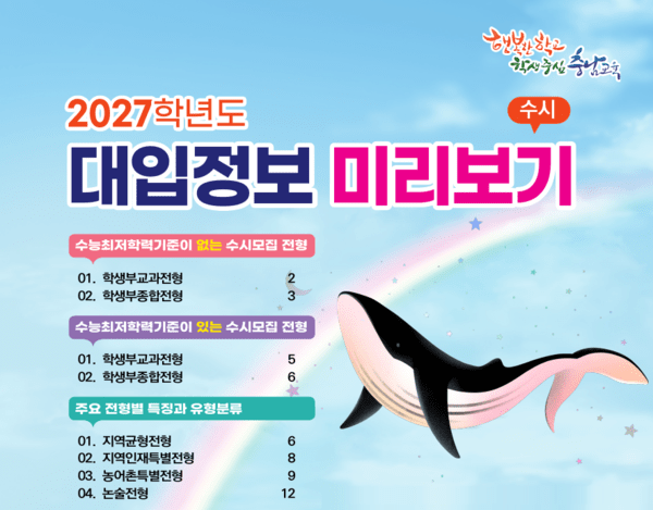 '수시 미리보기' 발간충남교육청 배포 자료 분석... 의약 계열 확대와 학교폭력 의무 반영, 수시 중심 대비가 관건 [교육을 비추다 기자] 2027학년도 대학입학전형은 '지역인재 전형 확대'와 '학교폭력 조치사항 의무 반영'이라는 두 가지 거대한 파도가 충돌하는 지점이다. 특히 충남, 충북, 대전, 세종을 아우르는 충청권 수험생에게는 전례 없는 기회이자 위기가 될 전망이다. 충청남도교육청진로융합교육원이 발표한 2027학년도 대입정보 미리보기 자료는 이러한 변화의 흐름을 명확히 보여준다. 변화하는 입시 지형 속에서 수험생과 학부모가 반드시 확인해야 할 핵심 전략을 분석했다. 충청남도교육청진로융....... <img src="https://blogthumb.pstatic.net/MjAyNjAyMDRfMjg1/MDAxNzcwMTcwNDAxMjQ1.0PgbtZnNc_HGt2JbOT4iJFJzw42wsPrXzs_d1uniHKog.ucEwCZDUdnsgygafJXBntfIIZhhdmk_j-EUOaDZDXJkg.PNG/3837_3739_411.png?type=s3" />