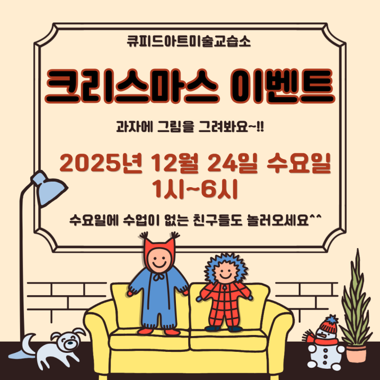 안녕하세요~ 12월 24일 큐피드아트에서 진행하는 이벤트 안내드립니다. 추운 겨울 감기 조심하시고 항상 건강하세요^^ <img src="https://blogthumb.pstatic.net/MjAyNTEyMTVfMTI3/MDAxNzY1NzY5NjUxOTM3.nPyg7sQSfFFyL4b7rETFyVFzTtwndSKjFQFguvgJOzUg.US2nMBs6xZzRRr3vv47qhkje4yaiMqSbyQUmoyYSnxYg.PNG/KakaoTalk_20251213_224609002.png?type=s3" />