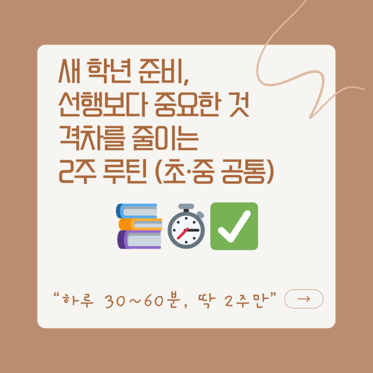 새 학년 준비라고 하면 보통 “선행부터 해야 하나?”가 먼저 떠오르죠. 그런데 실제로 학기 초에 성적과 자신감을 가르는 건 선행의 양보다 **공부를 지속할 수 있는 힘(공부 체력)**인 경우가 훨씬 많습니다. 특히 초·중등은 새 학년이 시작되면 숙제, 수행평가, 단원평가, 학교 일정이 한꺼번에 몰려옵니다. 이때 **‘매일 조금씩 해내는 루틴’**이 있는 아이는 흔들리지 않고, 루틴이 없는 아이는 계획이 있어도 쉽게 무너져요. 그래서 오늘은 새 학년을 앞둔 2주 동안, 선행보다 먼저 잡아야 할 **“격차를 줄이는 2주 루틴”**을 정리해드릴게요. 1) 새 학년 준비의 핵심은 “공부량”이 아니라 “지속력” 새 학년 초는 누구나 열심히 해....... <img src="https://blogthumb.pstatic.net/MjAyNTEyMTZfMTkg/MDAxNzY1ODY1NjMyMzIw._lqJAyH9I6xLsH0qSSL8KOQHfGU6JeIsOisibwo7LnIg.rIiEfsODH_FGZ4xF3dCOXCLlhANt8TWH3bkIxp4k5UEg.PNG/%BB%F5%C7%D0%B3%E21.png?type=s3" />