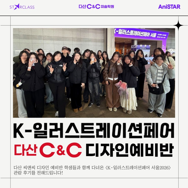 안녕하세요! 남양주 다산C&C미술학원입니다. 다산 씨앤씨 디자인 예비반 학생들과 함께 다녀온 <K-일러스트레이션페어 서울2026> 관람 후기를 전해드리려고 합니다. 이번 페어는 일러스트레이션, 그래픽디자인, 캐릭터디자인부터 독립출판, 웹툰, 게임, 애니메이션, 캘리그라피까지 정말 다양한 분야의 작업들을 한자리에서 만나볼 수 있는 전시였습니다! ✅행사명 : K-일러스트레이션페어 서울 206 ✅기간 : 2026년 1/29(목)~2/1(일) 4일간 ✅장소 : 서울 코엑스 Hall D ✅관람 시간 : 오전 11시~오후6시 ✅주최 : (주)한국국제전시 서울에서 열리는 K-일러스트레이션페어는 내년에 다시 만나볼 수 있을것 같네요~!ㅎㅎ 이제 사진을 통....... <img src="https://blogthumb.pstatic.net/MjAyNjAyMTRfMTQx/MDAxNzcxMDUyMzkyNTMx.AqpR_y0ItXho4BxzHaqbyBLnoX20LfWN3Dbf9y9E1tcg.sYUDKm3X9nJa3zUUVbyFUV43Bv00zOdnPSxknk5pbSAg.JPEG/%C1%A6%B8%F1%C0%BB_%C0%D4%B7%C2%C7%D8%C1%D6%BC%BC%BF%E4.-_%BA%B9%BB%E7%BA%BB_%281%29_%285%29.jpg?type=s3" />