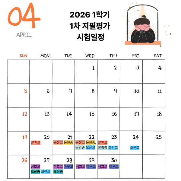 2026년 1학기 1차 지필평가 운천중 운암중 오산중 운천고 오산고 운암고 성호고 마루고 시험기간 중간고사