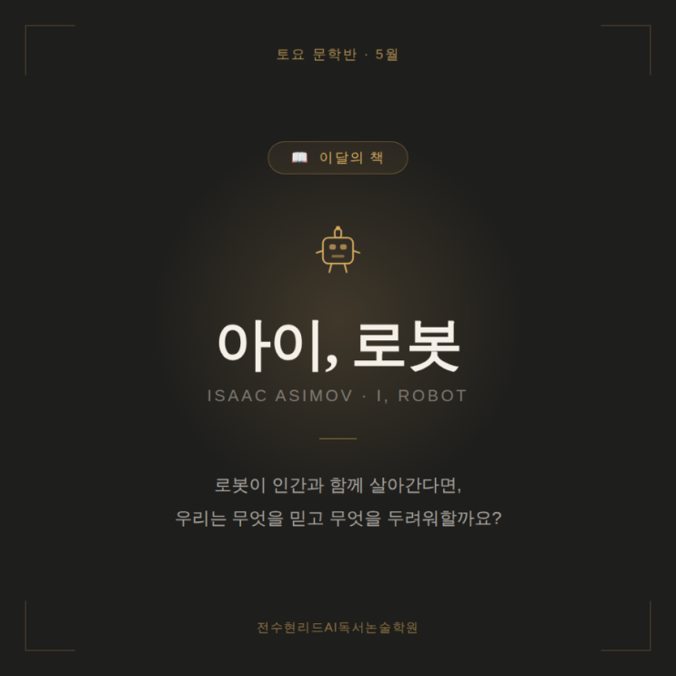 5월 주말고전독서반 안내드립니다. 이번달은 아이 로봇을 읽습니다. 지난달 동물농장을 읽으며 엄청난 토론을 했답니다. 그러다 이야기 나온 AI에 대한 이야기가 자연스럽게 나왔습니다. 자본가와 노동자에 대해 이야기 하다, 앞으로의 노동자의 위치는 AI가 대체하는 것이 아닐까? 로봇이나 인공지능에 대한 궁금증에 대해서 나온김에 아이로봇을 읽기로 했습니다. 책을 무조건 다 읽어야 합니다. 선생님은 책을 요약정리해주지 않습니다. 발표가 많습니다. 토론도 많습니다. 이번 책은 집에서 읽어와야 하는 부분이 많습니다. 로봇 공학 3원칙이 이렇게 소설에서 처음 등장했다는 사실이 조금 놀라웠습니다. 작가 자신은 이 원칙의 부족함을 알....... <img src="https://blogthumb.pstatic.net/MjAyNjA0MzBfMTc1/MDAxNzc3NTU2Mjg4NTkw.m5eB8RE0Sfkdbx2CFLUM4p4yOA3cM0UaPLiN5IVrLu4g.Corndpvhm68MEgraqulc-oRXEy_iOGkIgS7p7QR3JOIg.PNG/900_1777530583967.png?type=s3" />
