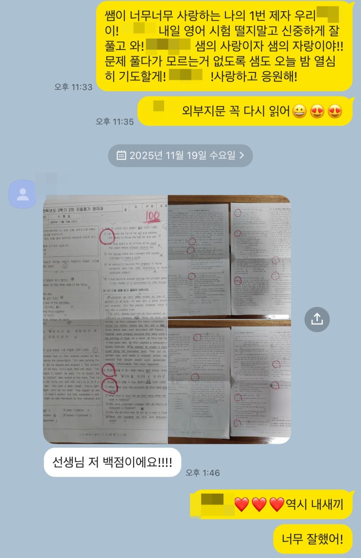 우리 학원의 마스코트 우리 귀여운 구갈중 3학년의 시험이 끝났습니다~^^ 이번 구갈중 3학년은 고1 모의고사를 외부지문으로 나눠줬더라구요~~ 그럼에도 우리 아이들 역시 100점을 척척 받아와주더라구요! 중학교 마지막 시험까지 완벽하게 잘 마무리 해주고 싶은 마음에 자주 불러서 체크하고 또 체크했답니다. 아무 소리 없이 잘 따라와준 우리 아이들이 마무리 까지 완벽하게 할 수 있었어요~ 헷갈리는 문제가 하나도 없었다는 우리 아이! 그만큼 시험범위에 대한 내용을 모두 알고 시험을 봤어요~~ 하이클래스 자체 내신대비 코스를 그대로 따라와준 우리 중3 친구들 !! (애들아! 고등부 수업은 더 환상적일거야!! 기대해도 좋아!!) 다른친구....... <img src="https://blogthumb.pstatic.net/MjAyNTExMjFfMjEg/MDAxNzYzNzI0NDU3MTY5.6iPVJl4sHXO_1A8v5lq7W4VBGe7W1LbIKil-YUAZj5sg.11e3JhIYevYif7dP2-F0k8Q213LcbdFKBqOPf2kq6GIg.JPEG/KakaoTalk_20251121_202134900.jpg?type=s3" />