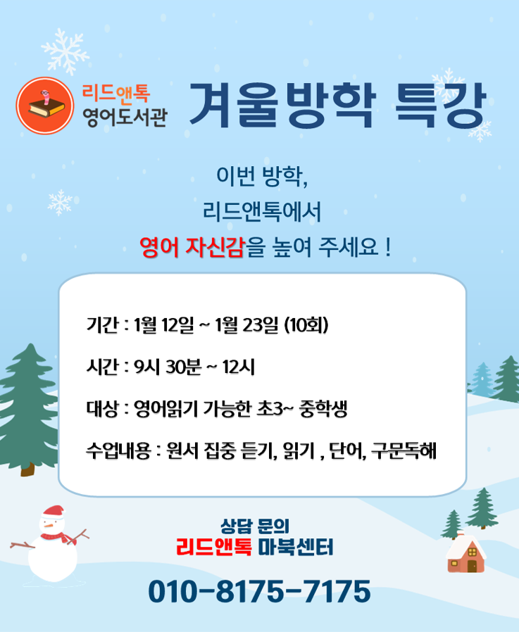 리드앤톡 기흥마북센터 Jinny입니다. 겨울 방학 특강 수업은 재원생, 비재원생 모두 신청가능합니다. 학기 중 부족했던 영어 학습량을 보충할 수 있는 소중한 기회입니다! 2주간 몰입해서 영어원서를 듣고, 소리내서 읽고 , 책에 대해 이야기 나눌 수 있는 수업입니다. 특강이 끝나고 나면 참여했던 친구들의 듣기, 읽기 집중 시간이 확연히 늘어난 것을 항상 확인하고 놀라곤 합니다. 스스로 방학 때 늦잠자지 않고 매일 와서 영어공부를 했다는 성취감도 엄청나구요. (오전 특강을 신청한 학생의 경우, 오후 수업은 듣지 않습니다.) <특강 수업료> 22만원(10회) <리드앤톡 방학 중 오픈 시간> 특강 기간 : 오전 9시반 ~ 12시(특강....... <img src="https://blogthumb.pstatic.net/MjAyNTExMjdfNTYg/MDAxNzY0MjE5NTYzMzA3.9_WEkqHtOieyFItXNTotf6x1UP8ewMbdxIBSZblw1Ggg.rxtsgaMw0_kXX6RlFejeI23jxm8flt2iAokGK7AzK-Mg.PNG/%B1%D7%B8%B21.png?type=s3" />