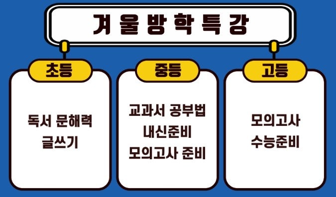 안녕하세요, 고래영어 보라위드 캠퍼스 입니다 ❄️ 2025 겨울방학 중등부 특강 안내 탄탄한 기초 + 실전 대비로 새 학기를 완벽 준비! 올해 여름방학 동안 진행되었던 문법 특강과 내신 대비 프로그램이 학생들과 학부모님 모두에게 큰 호응을 얻었습니다. 이 겨울방학에도 그 성과를 이어, 학생들이 새 학기를 가장 잘 준비할 수 있는 맞춤형 특강 프로그램을 운영합니다! 짧지만 중요한 겨울방학, 고래영어와 함께 가장 알차게 보내세요 문법 특강: 헷갈리는 문법을 완벽 정리하는 시간 영어 실력의 기반은 결국 ‘문법’입니다. 이번 겨울 문법 특강에서는 학생들이 한 학기 동안 헷갈렸던 문법 개념을 정리하고, 2학기 및 다.......