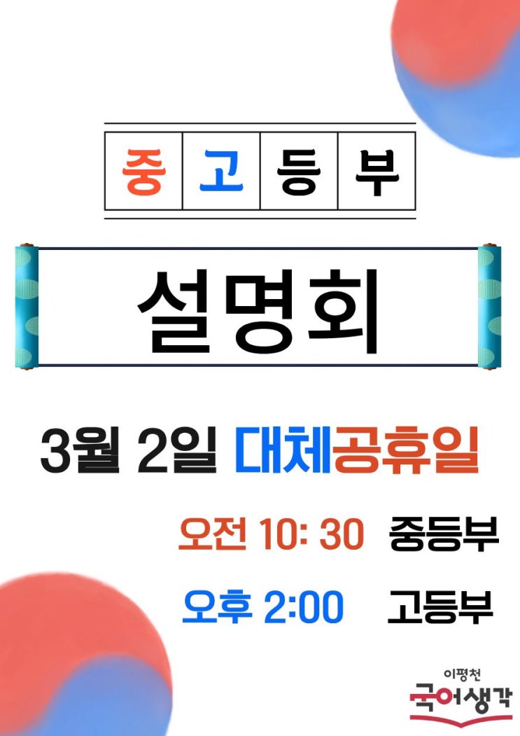 안녕하세요? 이평천국어생각 수지본원입니다. 중1, 고1 입학을 앞두고 기대와 걱정이 교차하는 시기입니다. 내가 진학하는 학교는 어떤 분위기이며 내신은 또 어떻게 출제되는 걸까? 많이들 궁금해 하시는데요, 특히 요즈음 국어과목에 대한 관심과 이목이 높습니다. 국어과목이 수능에서 어렵게 출제되다 보니 저학년 때부터 준비해야 한다는 목소리가 높아지고 있죠? 수지지역 중고등학교 학교별 내신은 물론 수능 국어준비까지 어떻게 해야 하는지 속시원히 밝혀줄 귀한 설명회가 준비되어 있어 소개해 드립니다. 풍성한 새봄맞이 이벤트까지 진행한다고 하니 중고등부 학부모,학생 여러분들 많이 많이 참여해 보세요~^^ <특별 설명회 이벤....... <img src="https://blogthumb.pstatic.net/MjAyNjAyMTFfODIg/MDAxNzcwNzkwOTE3NjA4.MBe1441_0dORJJ505tKEXbGRSICBkmAGQla4D5nqqJwg._7w-r1hBqLEig9GrN7FbRF8Dcep4yQvzkOaeRvD6tO0g.JPEG/수지_중고등부_설명회(260301).jpg?type=s3" />