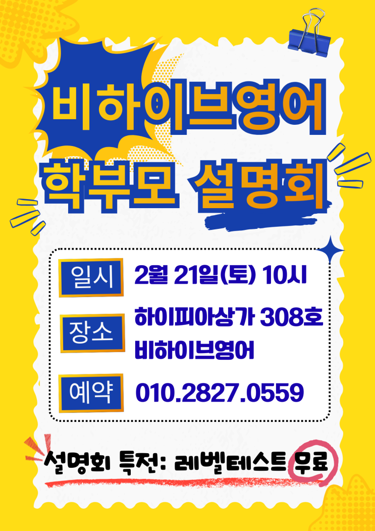 비하이브영어학원 2026년 학부모 설명회 초등·중등전문 영어학원 비하이브영어학원 신입생 설명회 안내 아이마다 영어를 받아들이는 속도가 다르고 필요한 공부 내용도 다릅니다. 비하이브영어학원은 먼저 아이 한 명 한 명을 제대로 들여다보는 것에서 수업을 시작합니다. 이번 신입생 설명회에서는 비하이브 영어학원의 상세한 커리큘럼을 안내하고 아이의 현재 수준을 어떻게 진단하고 성장 경로를 그리는지 초등–중등으로 이어지는 영어 학습의 방향은 무엇인지 를 설명드립니다. 설명회 참석 학생에게는 정밀 레벨테스트 무료 제공 결과에 따른 개별 학습 방향 안내 아이 성향과 속도를 고려한 수업 제안 을 함....... <img src="https://blogthumb.pstatic.net/MjAyNjAyMTBfNDUg/MDAxNzcwNzA0ODg2Njkw.lhKZxkpYIEYT7DG2auX1xlHnX6giFc00uBD0o8ZYyd8g.xO5QDvj6ltecQ2egp4VPuoPTte1bVGfGC3uLLSTGU68g.PNG/3.png?type=s3" />