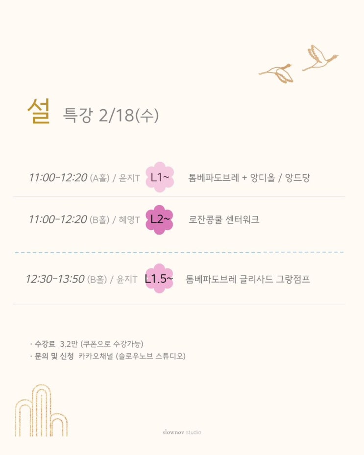 안녕하세요 슬로우노브 발레학원입니다 2.18(수) 알차고 재미있는 특강 클래스가 열립니다! L1~ 11:00-12:20(윤지T) 톰베파도브레의 정확한 스텝, 앙디올과 앙드당 턴 깨끗하게 한바퀴 돌기! 윤지선생님만의 발레 공식으로 군더더기 없는 한바퀴 턴 만들기 클래스입니다 L2~ 11:00-12:20(혜영T) 2026 로잔콩쿨 클래스 센터워크 동작들을 활용한 높은 레벨 클래스입니다 부드럽지만 단단한 폴드브라와 하체를 조화롭게 만들어보는 클래스입니다 L1.5~ 12:30-13:50(윤지T) 톰베파도브레 글리사드 + 그랑점프! 윤지선생님만의 족집게 큐잉으로 알려드립니다 스텝을 뭉개지 않고 팔.다리 정확한 콤비를 만드는 그랑점프 집중 클래스입....... <img src="https://blogthumb.pstatic.net/MjAyNjAyMTJfMjA3/MDAxNzcwODgwMzc0MDM4.vv_yOhKOiwCrF1bT_HSjwlWDSxG1kVRtagXmUepHqOMg.LwbsoMaxfJfaUyHpDWX1jEVu-8OZAiwDH-x48B8YZmcg.JPEG/IMG%A3%DF4540.JPG?type=s3" />