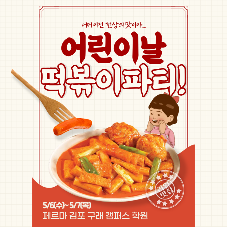 안녕하세요. 구래동 수학학원 "생각하는 수학" 페르마 김포구래 캠퍼스 입니다. 벌써 싱그러운 5월이 다가왔습니다. 5월 하면 빼놓을 수 없는 것, 바로 어린이날이죠! 우리 페르마 친구들이 평소 학업에 열심히 정진하는 모습이 참 대견하고 기특합니다. 그 마음을 담아, 작년 어린이날에 학생들에게 큰 사랑을 받았던 그 이벤트를 올해도 야심 차게 준비했습니다! "선생님, 작년 떡볶이 파티 진짜 재밌었어요!" 작년 파티 때, 우리 아이들이 떡볶이를 너무 맛있게 먹고 친구들과 즐겁게 웃던 모습이 아직도 생생합니다. "내년에도 또 해주세요!"라며 아쉬워하던 아이들의 얼굴이 떠올라, 올해도 아이들을 위해 떡....... <img src="https://blogthumb.pstatic.net/MjAyNjA0MjdfMTM2/MDAxNzc3MjgyMzM3NjEz.emYqtLKPGoNpPHAGNZFLiN7vJZftjXTotGlg5sqqhwUg.eAkHG5DcjOdkkTxE4pDtAoHAEZaeMvU56nRccV0BLswg.PNG/%B6%B1%BA%BA%C0%CC_%C6%C4%C6%BC.png?type=s3" />