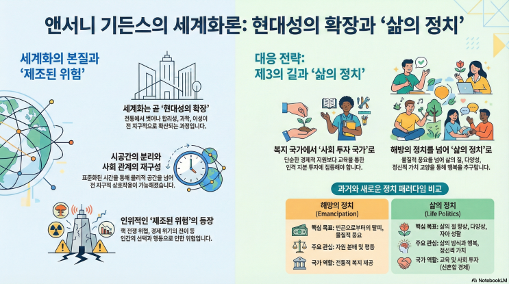 이 자료는 앤서니 기든스가 정의한 세계화를 현대성의 확장으로 규정하며, 시공간의 분리와 사회적 관계의 재구성을 그 특징으로 설명합니다. 기든스는 현대 사회가 직면한 제조된 위험에 주목하며, 특히 국가 간의 군사적 경쟁이나 경제적 상호 의존으로 인한 위기가 전 지구적으로 확산될 수 있음을 경고합니다. 그러나 그는 세계화를 통해 민주주의가 확산되고 신흥국들이 경제적 부를 창출할 수 있다는 긍정적인 측면도 함께 제시합니다. 이러한 환경 속에서 기든스는 시장 지배적인 신자유주의나 전통적인 복지국가 대신, 인적 자본에 투자하여 개인의 역량을 강화하는 '제3의 길'을 대안으로 제안합니다. 최종적으로 그는 물질적....... <img src="https://blogthumb.pstatic.net/MjAyNjAyMTNfNzAg/MDAxNzcwOTY4MDcwNDEz.9XM54Z0fI2XrgAUAGK4MvjUFvzoCvO74nRkfDfHSU0Ig.GQX7_rKK5wrtg-YSAxvs2ylucv6iCJLVBcKygCokAgAg.PNG/unnamed_%2842%29.png?type=s3" />